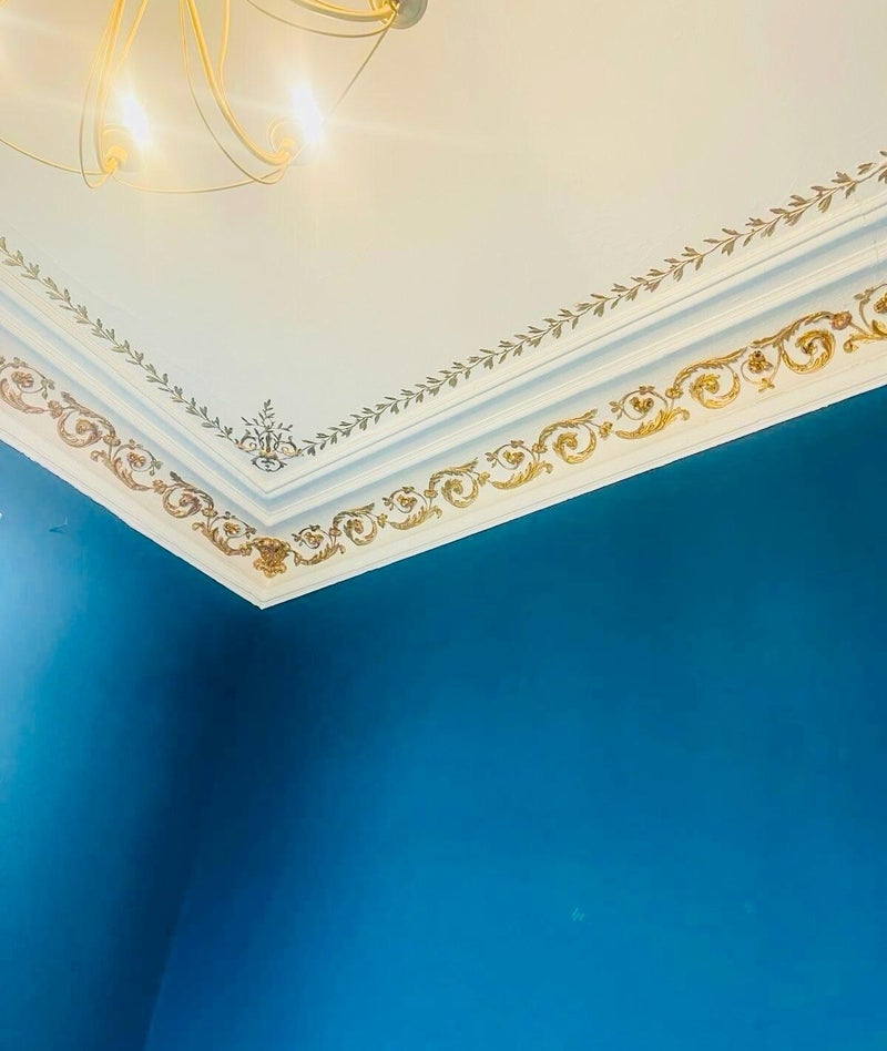 Le bleu pétrole en combinaison avec les magnifiques ornements vieil or du plafond.